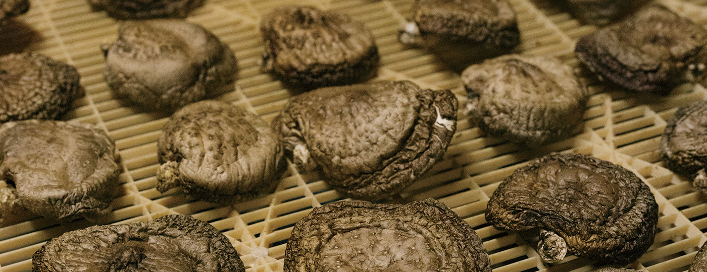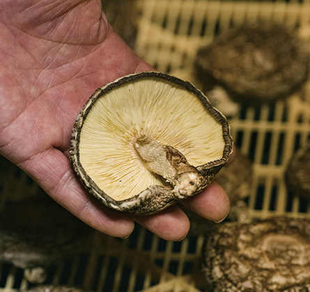 収穫してから乾燥を開始するまでの時間が短ければ短いほど乾椎茸は風味豊かになる。よい乾椎茸の見分け方は、形や大きさよりも、“おさ(傘の裏のひだ)”が、生のときのように立っていて、乳白~黄みがかったきれいな色かどうか。中川さんのところでは収穫後すぐに乾燥機に入れ、徐々に温度を上げていきながら、椎茸の状態を見極め、1日がかりでじっくりと乾燥させて、香りと旨みを引き出しいく。