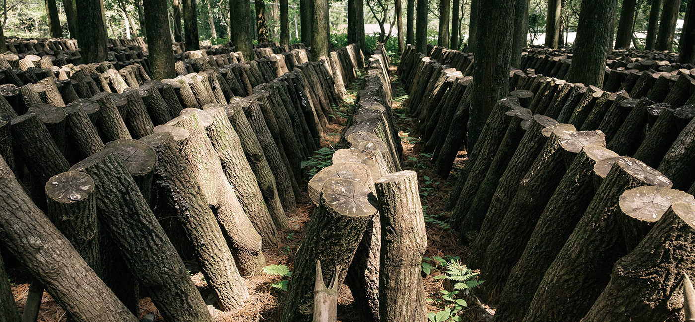 かつては自然発生するのを採取していただけでしたが、江戸時代から栽培が始まり、現在では原木栽培と菌床栽培があります。原木栽培は、森のなかの“ほだ場”で、クヌギなどの原木に椎茸の種菌(菌駒)を打ち込み、椎茸が出てくるのを待つ自然栽培。菌床栽培は、栄養剤と水分を加えた培地に植菌する人工栽培。早ければ3ヶ月ほどで収穫できるだけでなく、年間を通じて生の椎茸を安定供給できる利点があります。一方、原木栽培は収穫までに約2年かかります。原木を育てるところから換算するなら、消費者の食卓に届くまでおよそ20年がかり。そのうえ自然が相手ですから、豊作の年もあれば不作の年もあります。効率やスピードが優先されがちな現代においては、時代の逆を行く食品であるともいえるでしょう。