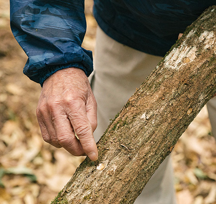 栽培は、原木となるクヌギを切り倒すことからスタート。伐採後、水分を抜いてから“玉切り”をします。玉切りとは、原木を扱いやすくするために1本の原木を約1メートル間隔で切り分けた“ほだ木”にすること。ほだ木のぐるりにドリルで等間隔に穴をあけ、種駒をハンマーで打ち込んでいきます。