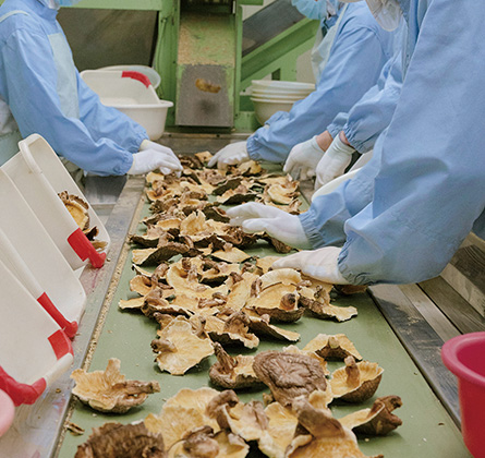 サイズや状態など50以上の厳格な基準に沿って乾椎茸を丁寧に選別し、香信(こうしん)や冬菇(どんこ)のほか用途によってスライス状や粉状などに加工して商品化。商品はそれぞれに多くの売り先をもっているのが、かしいの強み。それはつまりロスを出さないことを意味する。乾椎茸を市場で入札する際、質や形が不揃いであっても全量仕入れられ、生産者が売れ残りを抱えずに済む。