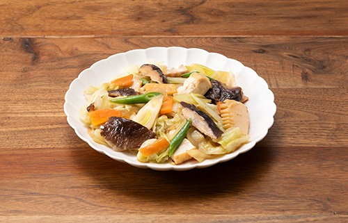 乾椎茸は水に浸けてやわらかく戻し、石づきを取り、傘は削ぎ切りし、軸は繊維にそって...
