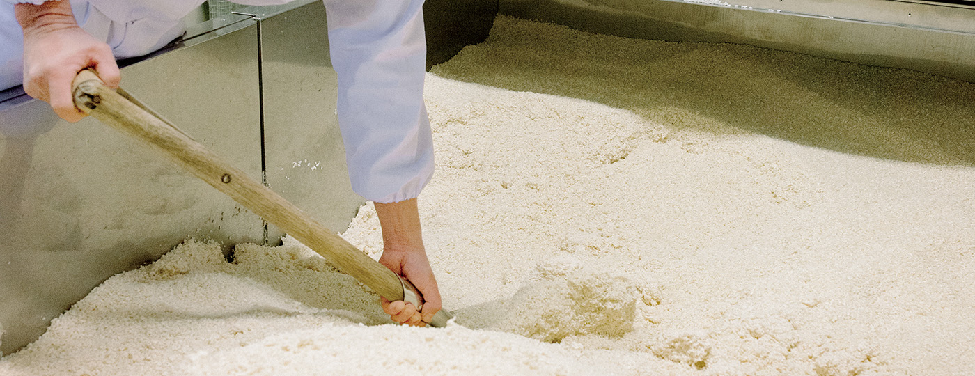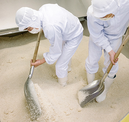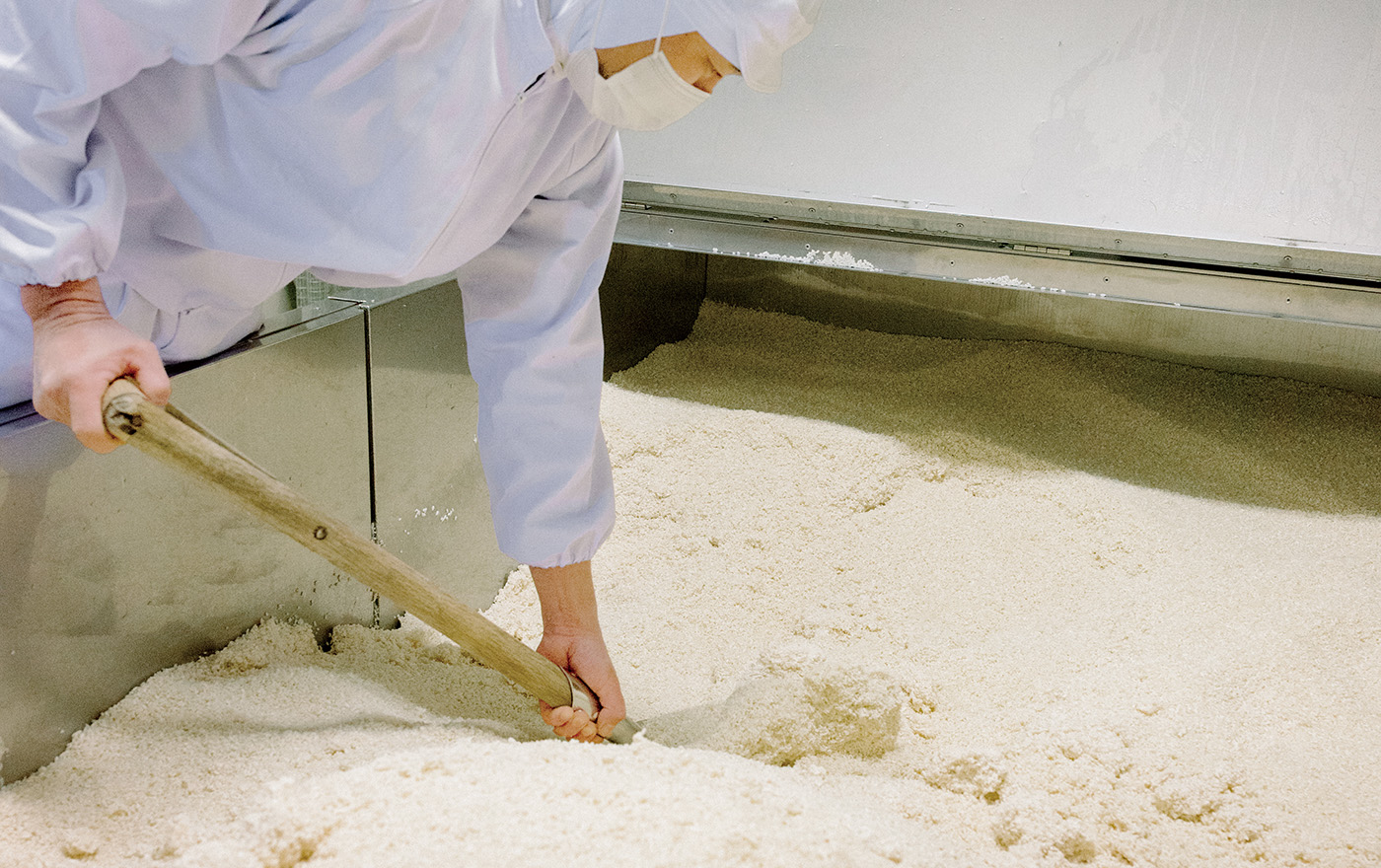 麹を温醸庫に運び入れてひと晩おくと、麹菌の代謝活動で発熱し始めます。翌朝、麹室に移してから40℃以上になった麹を今度は冷まし、“朝の切り返し”作業。ここでいかに丁寧に固まりをほぐすかが麹の出来を左右します。