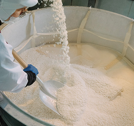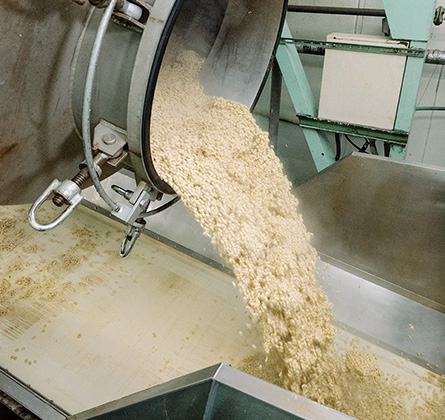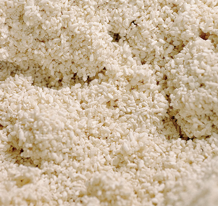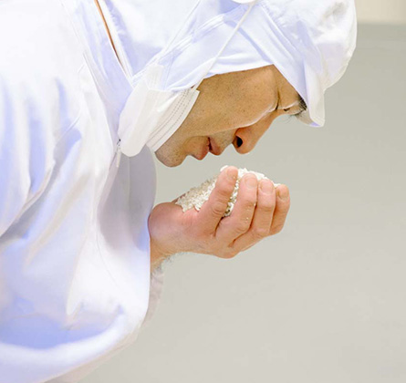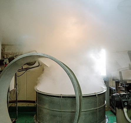 味噌づくりは、その麹づくりからスタート。まず、ひと晩浸漬した米を大釜で蒸します。山万で採用しているのは、米が均一に蒸せる“抜け掛け製法”。米を4層に分け段階的に蒸すことで蒸しムラを防ぐのですが、その時々の米の状態を見極めて浸漬と蒸しの時間を臨機応変に変えられる、職人の確かな腕が必要。また粉砕米や未熟米ではなく、良質な丸米を新鮮な状態で使うのは、そのほうが麹菌がうまくのるため。使用する米は基本的に信州産コシヒカリです。米が蒸し上がったら冷却し、麹菌の種付け。麹菌は高温すぎると死滅し、低温だと成長しないため、温度管理が重要で、適温は夏なら34℃、冬は36℃程度。ここでもやはり職人の経験が必須です。