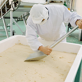 麹づくり、大豆の仕込み、麹と大豆と塩を合わせて(混合)熟成と、味噌づくりには大きく分けて3つの工程があります。なかでも最も重要なのが麹づくり。いい味噌ができるかは麹の出来次第なので、山万では手間ひまを惜しまず、日々、丹念に麹づくりに取り組んでいます。